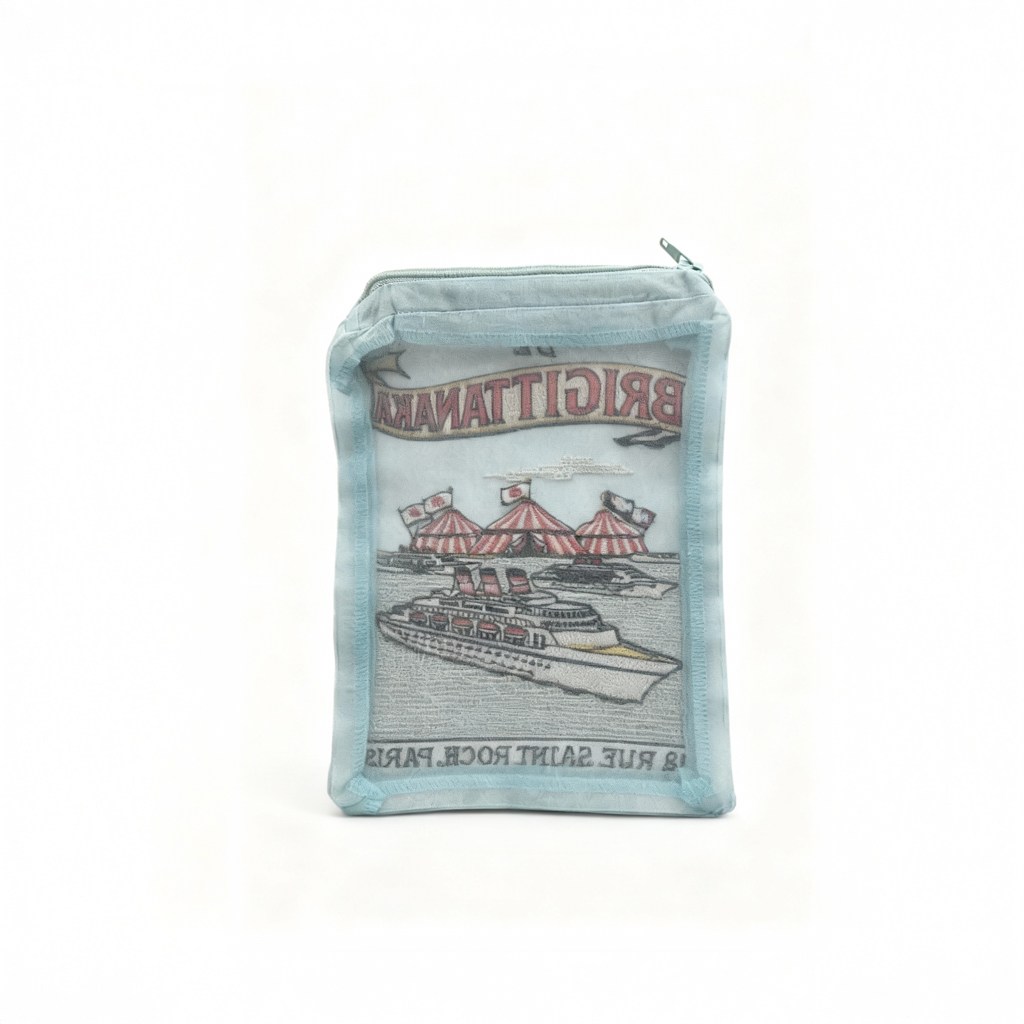 This embroidered organza pouch features a delicate seaside scene on a sheer light-blue base, capturing a light, playful, retro offbeat travel spirit.