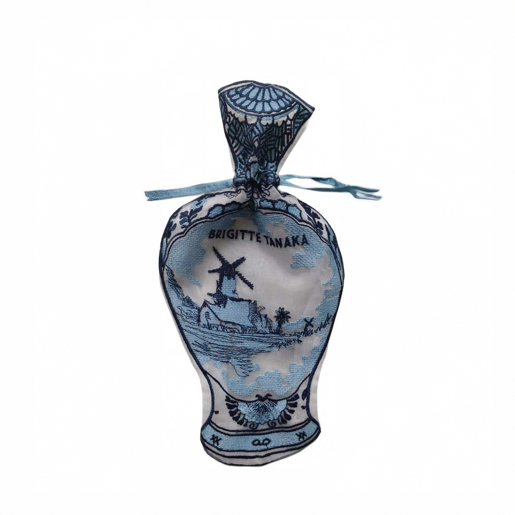 A pouch inspired by Dutch Delftware. Its original shape is beautifully embroidered in Delft blue for a unique and elegant look.