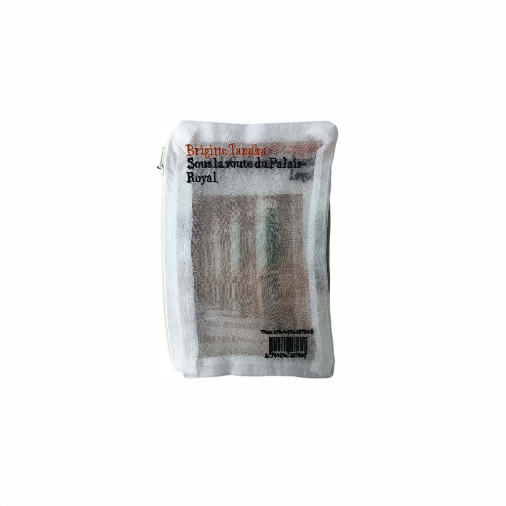 A printed and embroidered organza poouch designed like a book cover “Palais Royal” , combining delicate transparency with intricate decorative details.