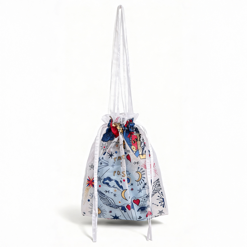 Discover the Divination Bag in organza, created as a limited edition in collaboration with the Moulin Rouge. Inspired by the mystical world of tarot cards, this bag combines refinement, elegance, and originality. An organza bag embroidered with tarot motifs.