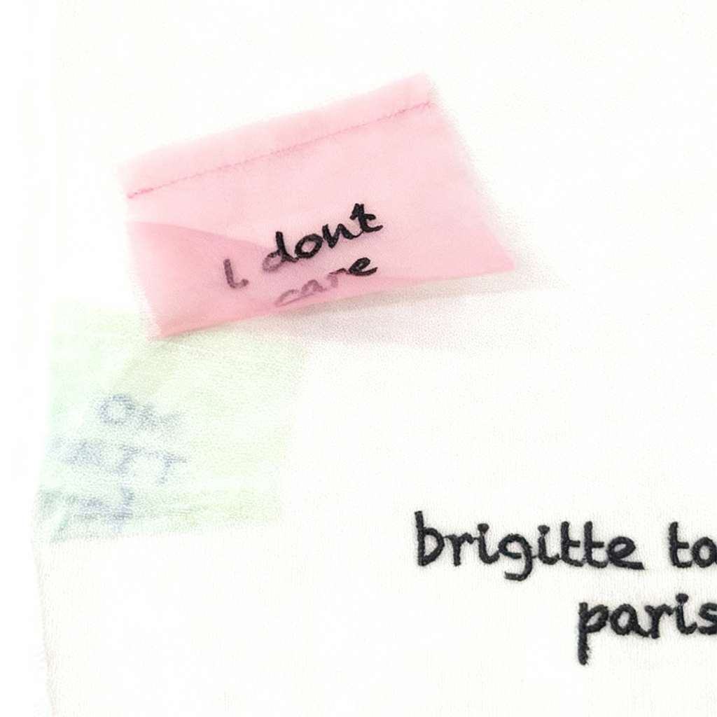 Colorful Post-it notes are sewn onto sheer organza, each embroidered with BT’s guiding beliefs. This creative layering gives the bag a playful and conceptual feel. Inside, a bright orange Post-it doubles as a practical pocket an unexpected detail that adds to its charm.