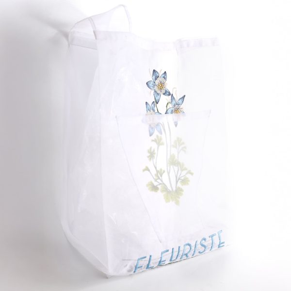 This lightweight organza bag is inspired by the poetic world of a florist. It is embroidered with delicate blue aquilegia flowers, symbolizing softness and elegance.